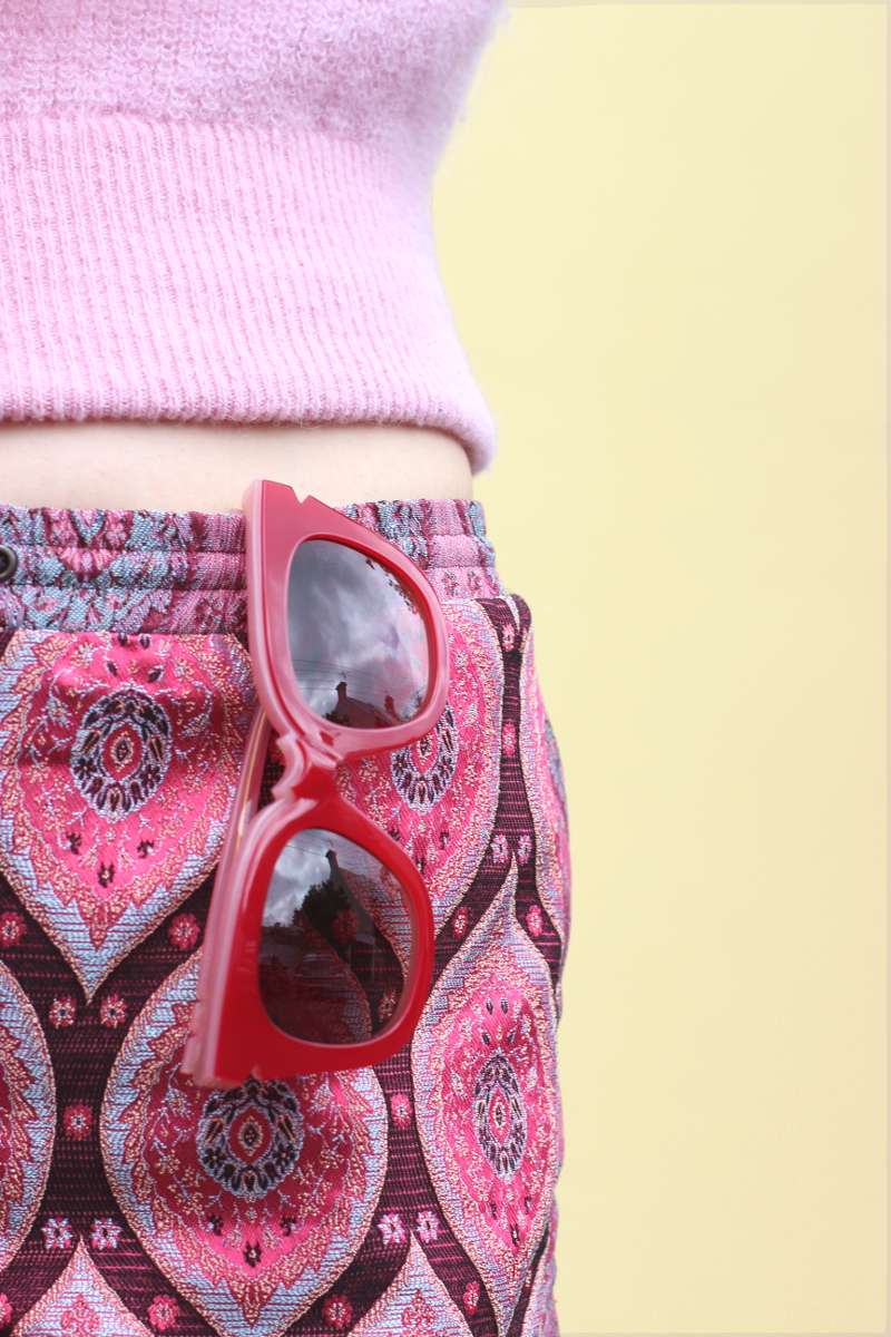 Poms + Pared Halva sunglasses in Burgundy worn with Prada Sweater and Asos Shorts